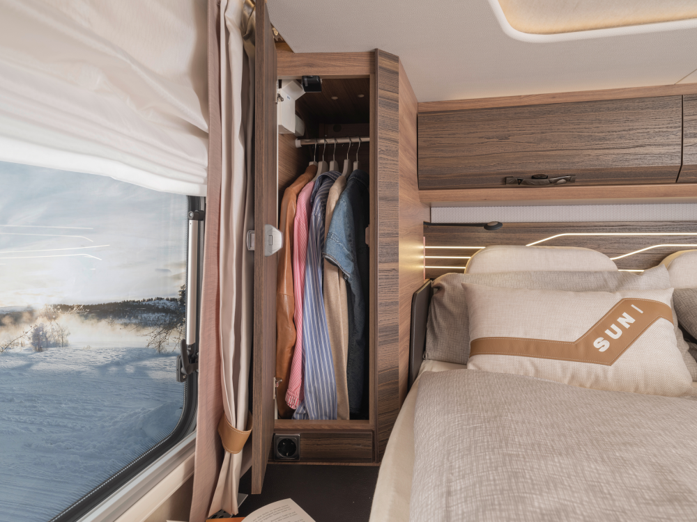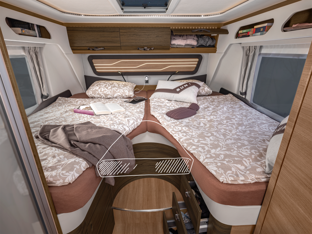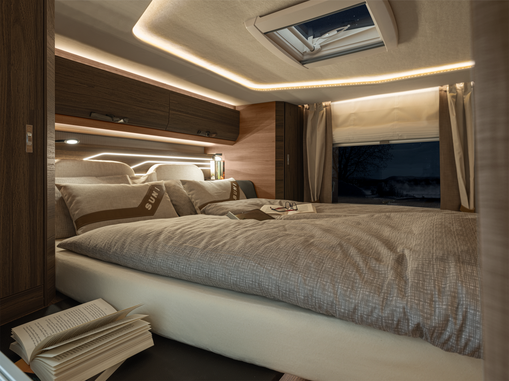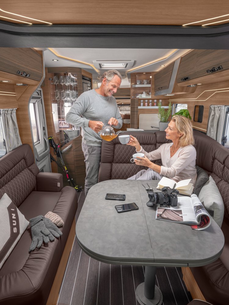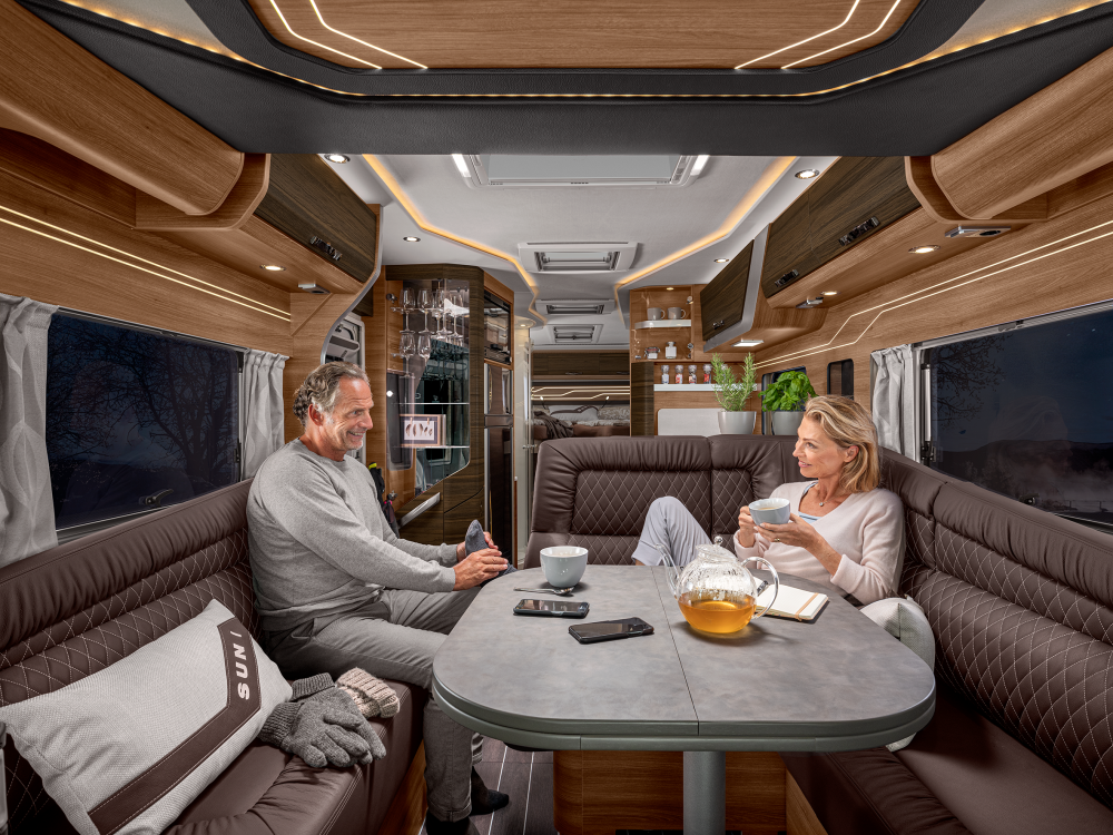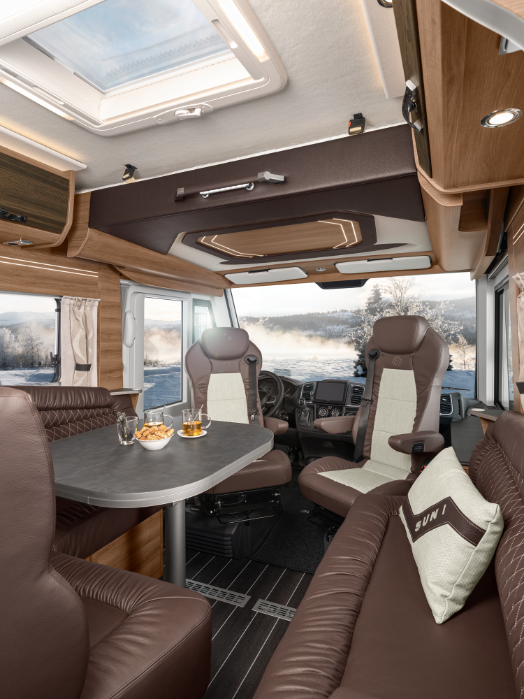 Volmaakt tot in het detail presenteren wij onze luxe liner. Met een voorkant en dynamisch exterieur beleeft u luxe die inspireert en sportieve elegantie die indruk maakt – zowel op lange ritten op de snelweg in het noorden als op bochtige provinciale wegen in het zuiden. Naast zijn imposante exterieuruitstraling overtuigt de SUN I echter ook met een stralend interieurdesign, zoals de verwarmbare dubbele vloer in Yacht‐look of de hoogwaardige lederen uitrusting. Stap en – en word met één oogopslag verliefd.